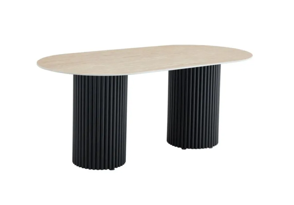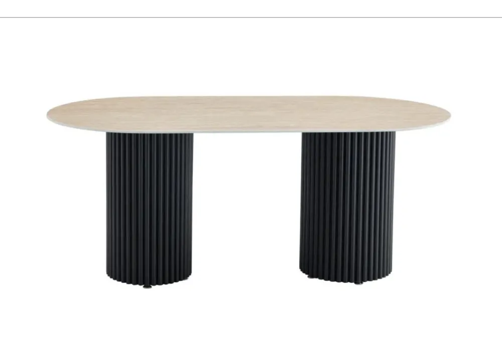 La table à manger Keysha est une pièce sophistiquée et contemporaine qui s’impose dans toute salle à manger. Son élégant plateau ovale en céramique durable, effet travertin réaliste, arbore un beige subtil et naturel. La surface en céramique est non seulement esthétique, mais aussi très pratique, résistante aux rayures, à la chaleur et aux éclaboussures. La table repose sur deux pieds cylindriques distincts en métal noir. Leur texture cannelée ou nervurée verticale ajoute un détail architectural saisissant et une esthétique industrielle moderne. Le contraste entre le plateau clair et naturel et le piètement foncé et texturé crée un point focal dynamique et élégant. Avec ses dimensions de 180 x 90 cm, cette table est suffisamment spacieuse pour accueillir confortablement une famille ou des invités, aussi bien pour des occasions décontractées que formelles.