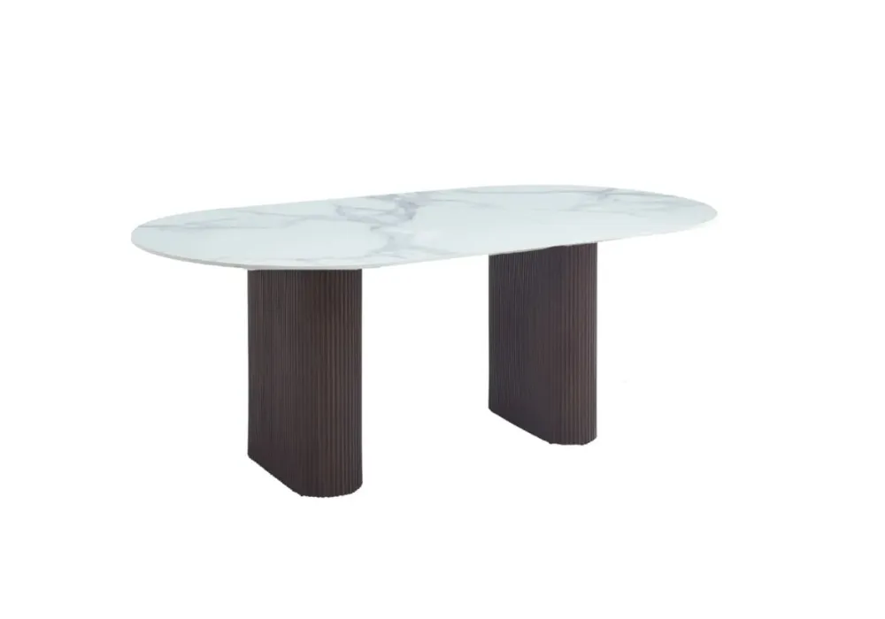 Élégante table à manger ovale avec plateau en marbre et pieds en bois modernes.Cette table est disponible en 2 tailles 160 x 90 et 180 x 90