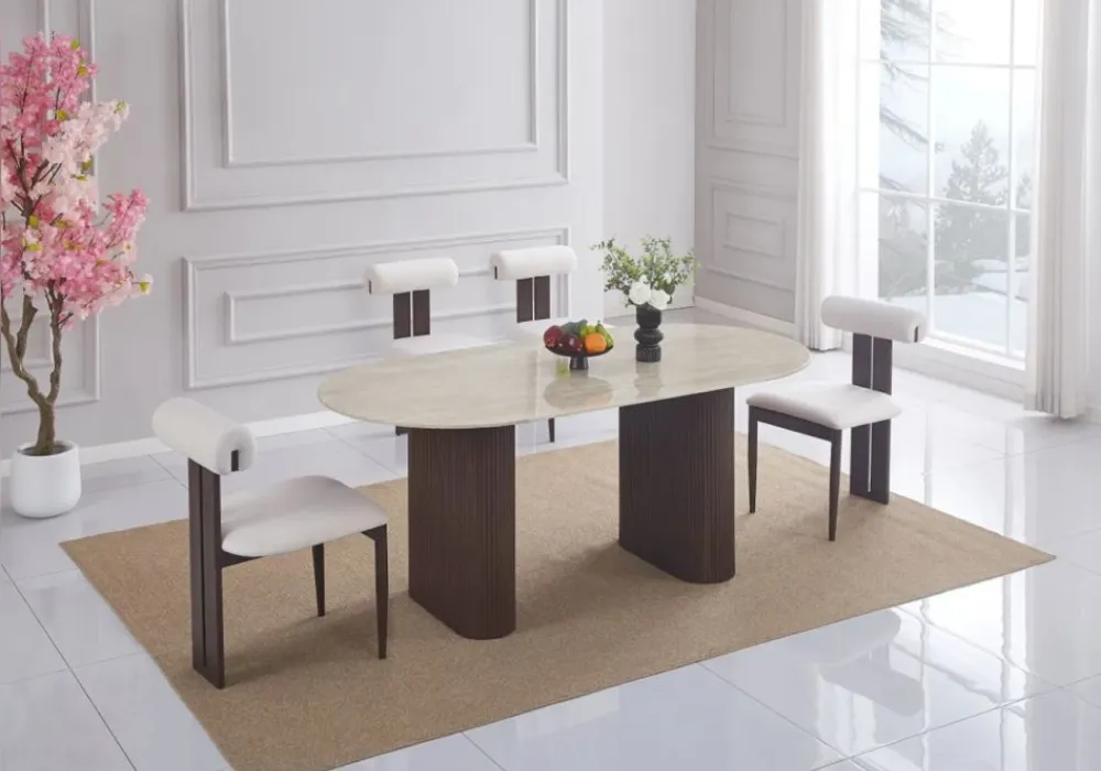 Ce superbe ensemble de salle à manger comprend une élégante table ovale avec plateau en marbre, soutenue par de robustes pieds en bois alliant durabilité et élégance. Sa surface lisse et polie allie style et praticité, idéale pour les repas de famille ou les réceptions. L’ensemble comprend des chaises contemporaines aux assises rembourrées et aux dossiers cylindriques uniques, alliant confort et esthétique moderne. Idéal pour rehausser le raffinement de votre salle à manger, cet ensemble de table allie luxe et fonctionnalité.