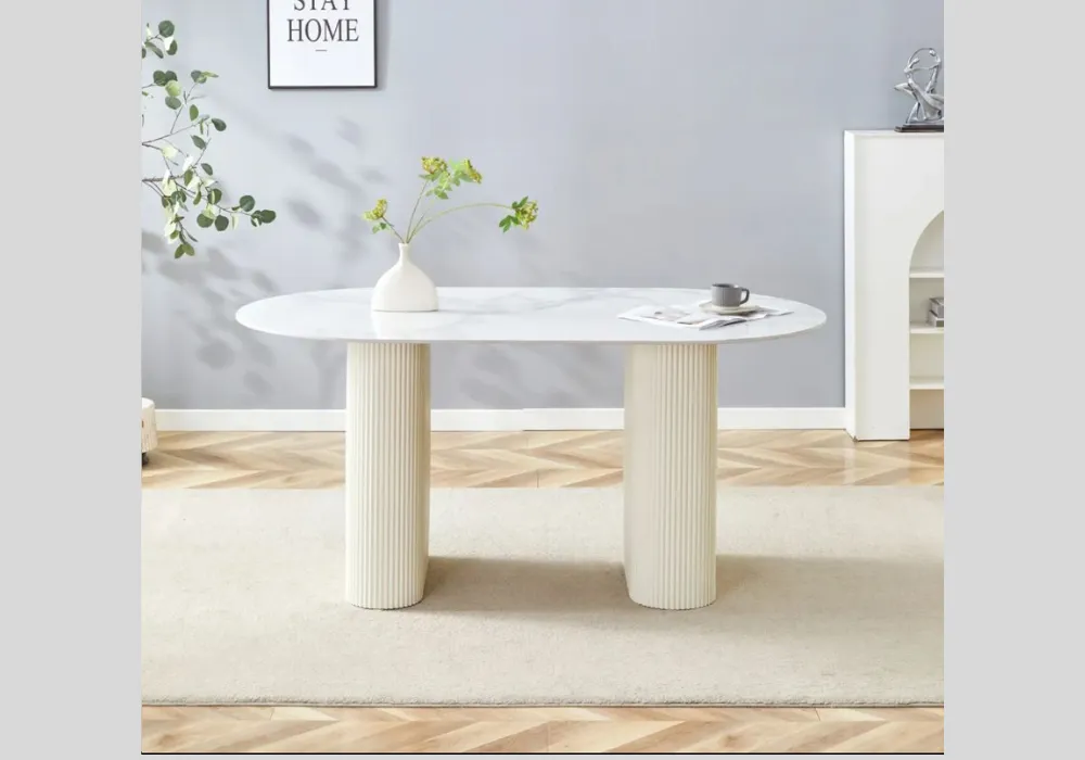 Le piètement distinctif de la table est composé de deux pieds solides, chacun en demi-lune ou semi-circulaire, avec une finition beige. Les pieds sont ornés d’une texture verticale nervurée ou cannelée, ajoutant un détail architectural unique et une touche de douceur au design. L’association d’un plateau élégant aspect marbre et d’un piètement beige texturé crée un mélange harmonieux d’élégance classique et de modernité. Ses lignes épurées et sa palette de couleurs vives font de cette table une pièce idéale pour une variété de styles d’intérieur, du scandinave au chic contemporain.